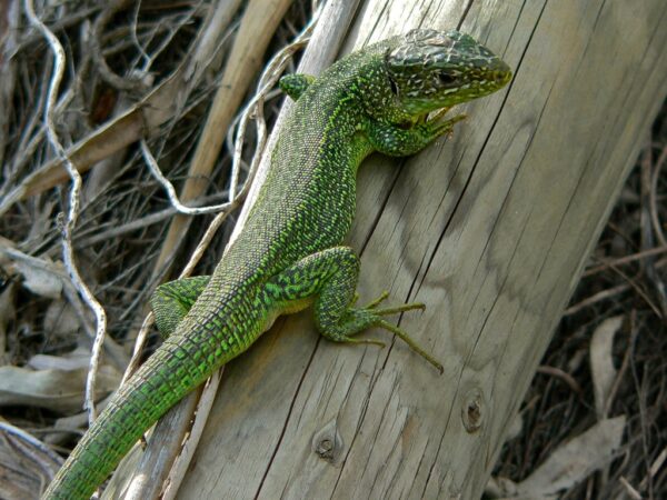 Las patas son verdes con los dedos larguísimos y adornadas con unas «ligas» rojas. Ambos sexos son iguales.